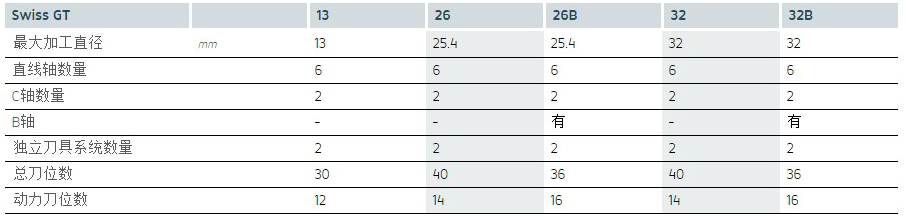 Swiss GT 26 和Swiss GT 32 可安裝高達40把刀具,包括14把動力刀,而Swiss GT 13 可配備多達30把刀具,包含12把動力刀。Y軸大幅提高了背軸加工的能力,無需二次加工即可完成某些復(fù)雜工件的生 產(chǎn)。