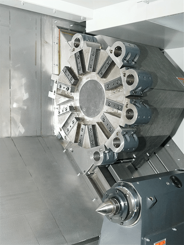 高剛性床身和主軸、大跨距硬軌,配合12工位液壓刀塔,保證了機(jī)床具有高效率、重切削特點(diǎn)。